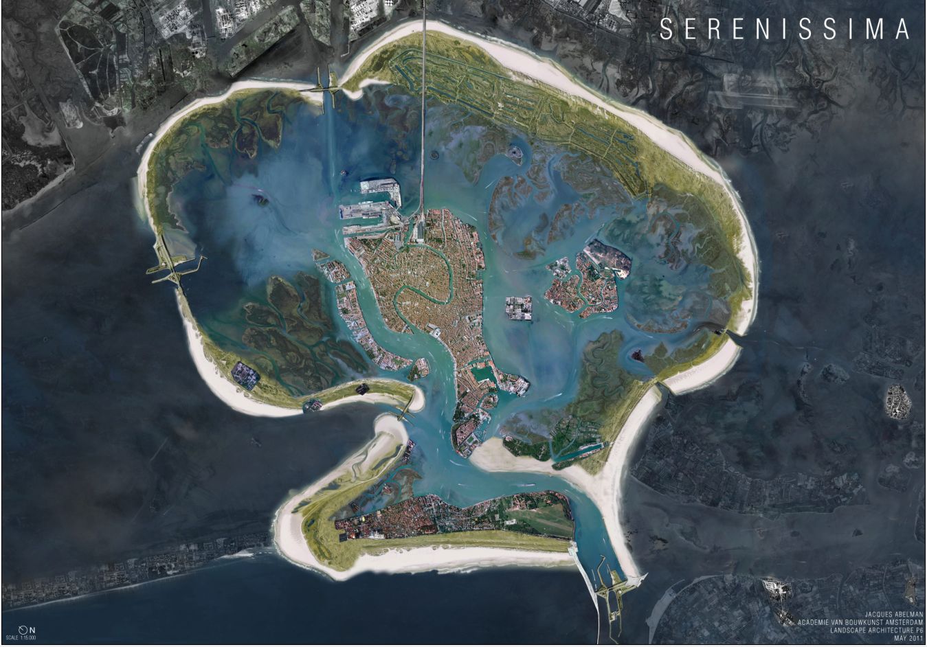 This designed land will function as a hybrid territory of landscape identities and new urban growth. Residential and business zones set into the emerald necklace will create a thriving future city, with the jewel of old Venice at its heart. The edge of the city will extend to the dunes and beaches facing the New Adriatic. Finally impervious to the elements and transformed into a new island nation, Venice will once more be married to the sea.